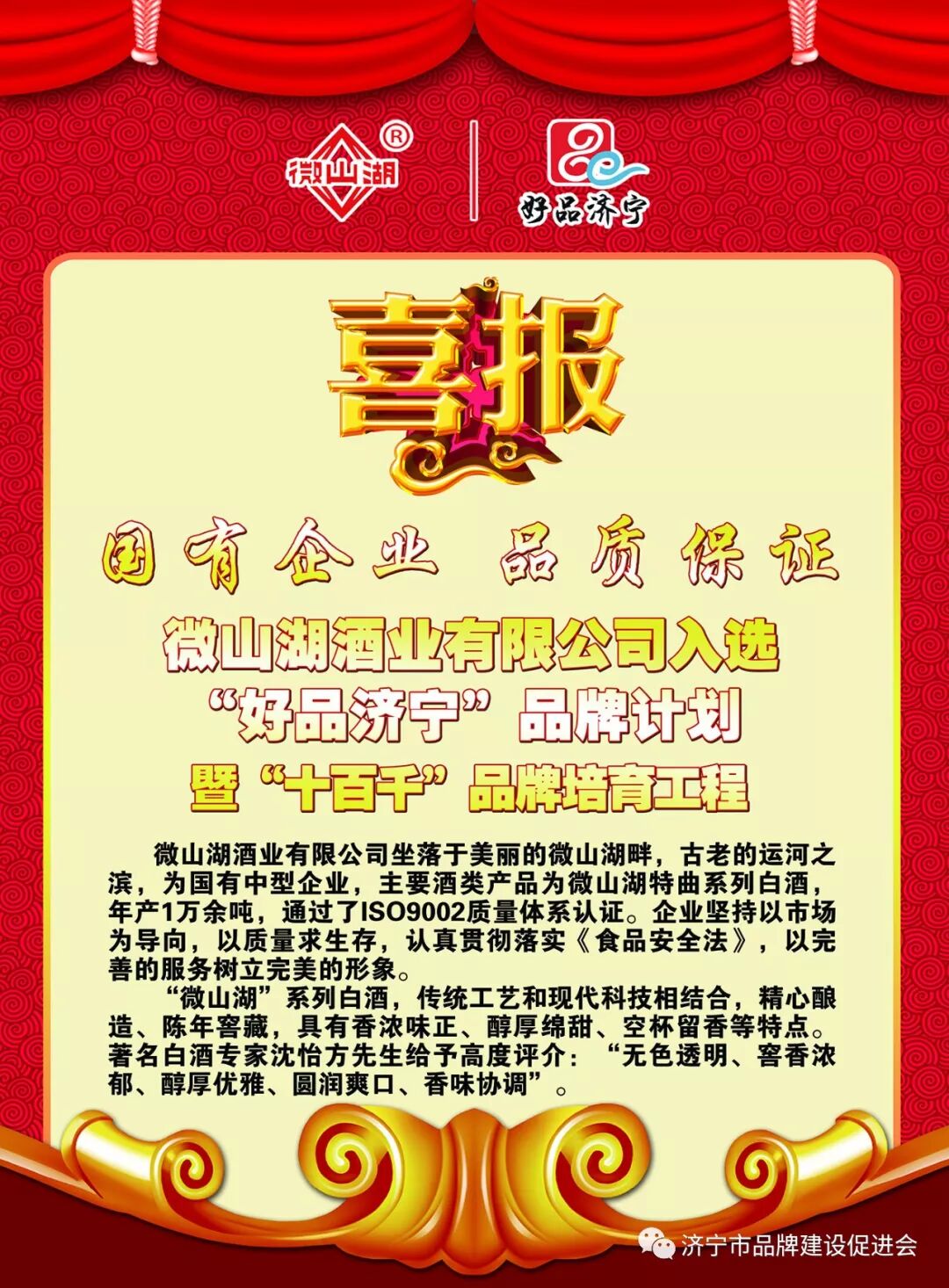 热烈祝贺微山县宏润酒业贸易有限公司入选“好品济宁”品牌计划暨首批“十百千”品牌培育工程 。