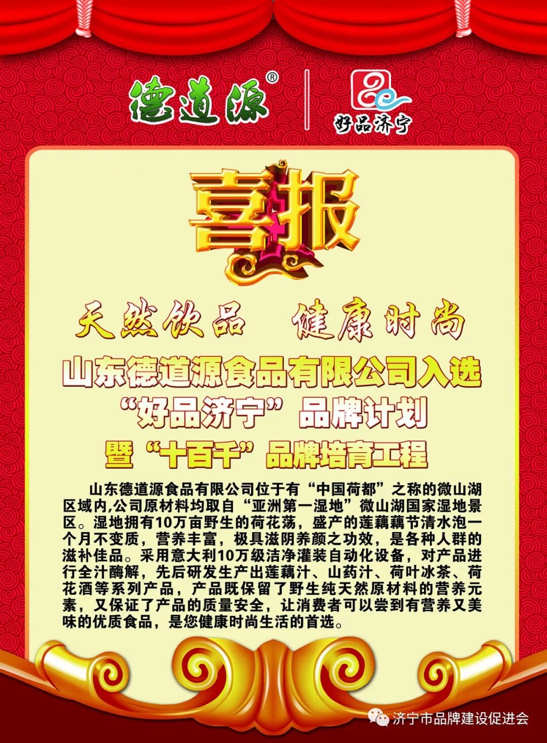 热烈祝贺山东德道源食品有限公司入选“好品济宁”品牌计划暨首批“十百千”品牌培育工程 。